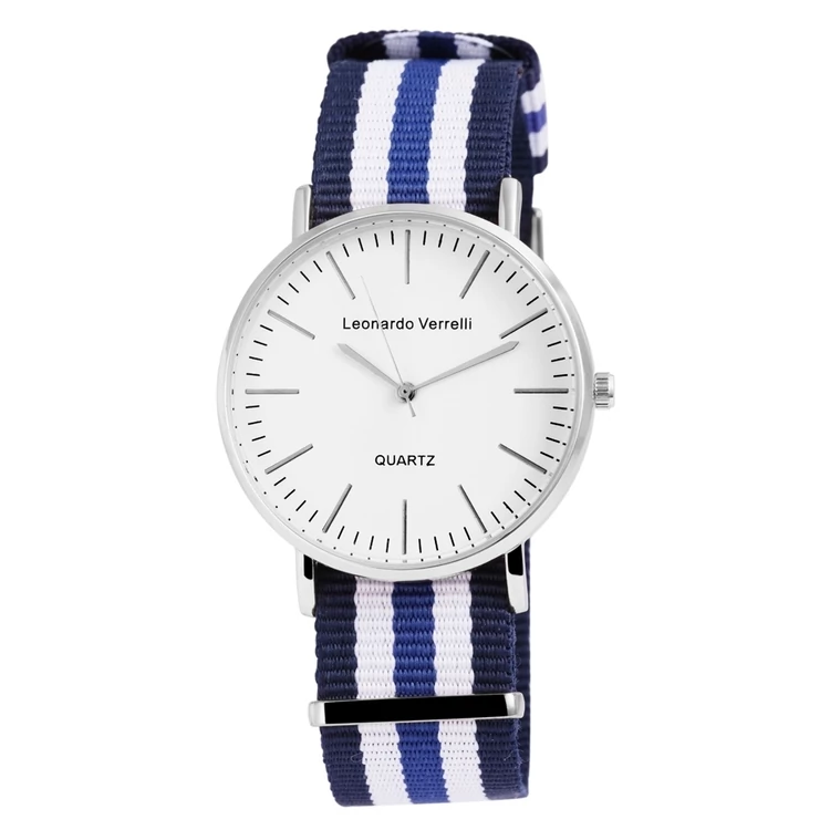 Elegáns szövet szíjas karóra. TULAJDONSÁGOK • erős szövet szíj • ásványi üveg • kiváló minőségű quartz-szerkezet • rozsdamentes acél hátlap MÉRETEK • ház szélessége: 40 mm • ház vastagsága: 7 mm • szíj hossza: 240 mm • szíj szélessége: 20 mm